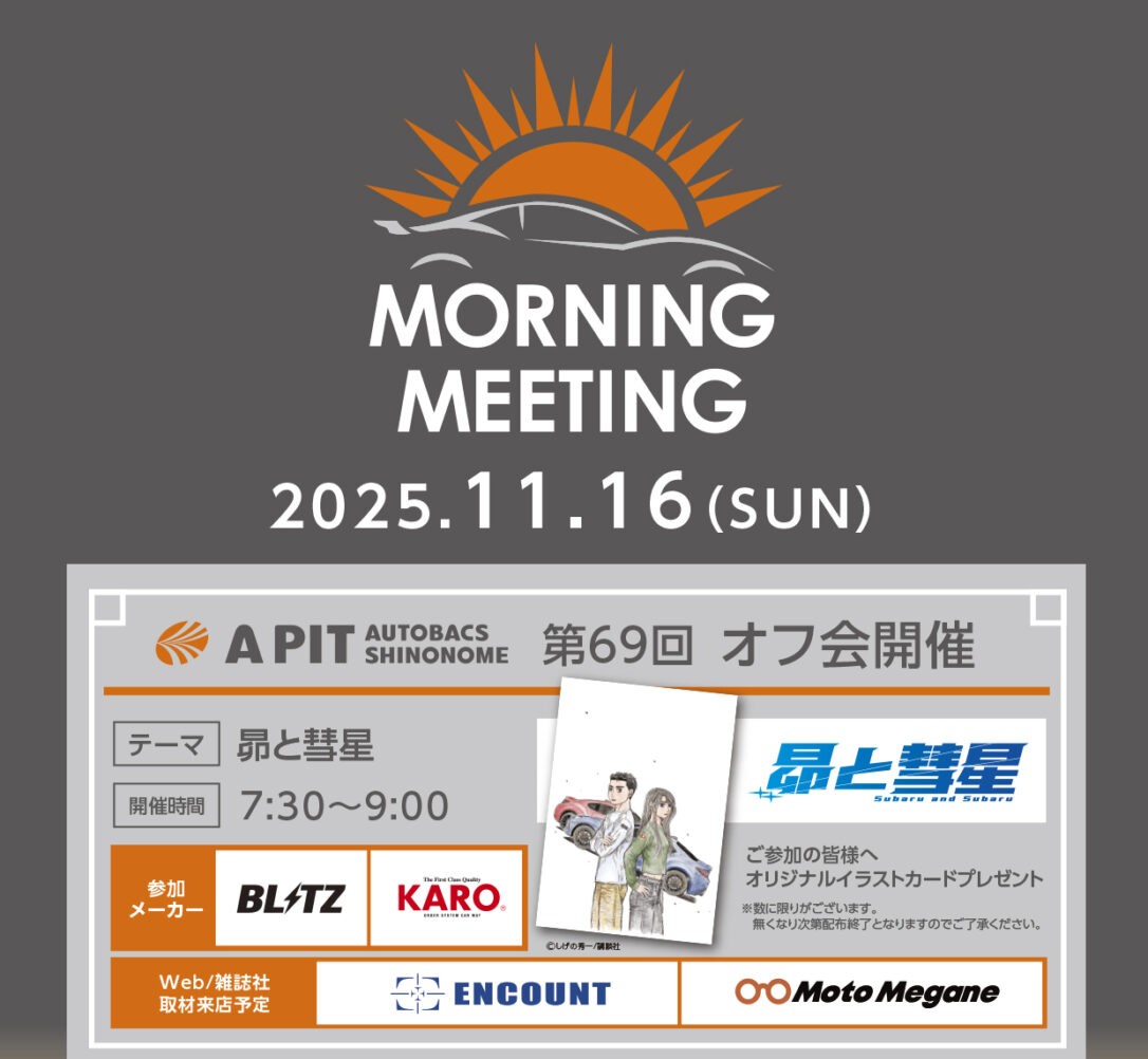 2025年11月16日(日)、A PITオートバックス東雲で開催された「第69回モーニングミーティング テーマ : 漫画 “昴と彗星” 登場車種」は、同作に登場するトヨタ・86やスバル・BRZを中心とした車両オーナーを対象とした朝限定のミーティングです。