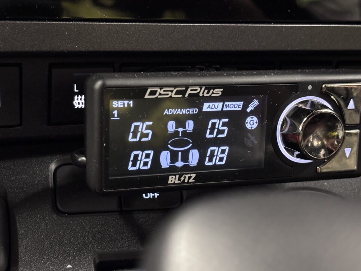 車内のコンソールでサスセッティングができるようにBLITZのDSC PLUSを装着しています」