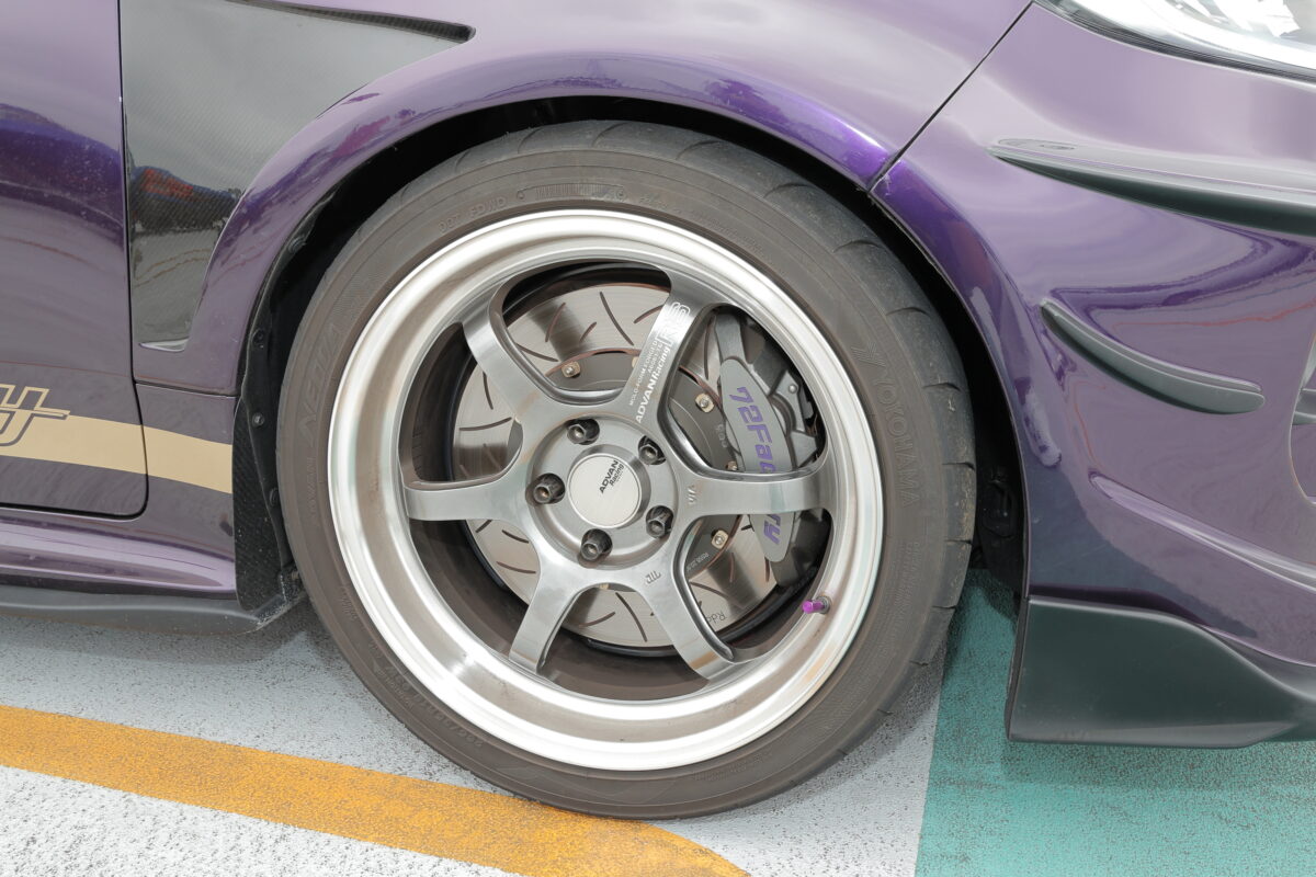 ブレーキはローターを変更し、ノーマルのキャリパーと組み合わせ。ただしノーマルキャリパーと言っても、削って72Factory の文字を入れている。細かな部分までこだわりを詰め込んでいる。