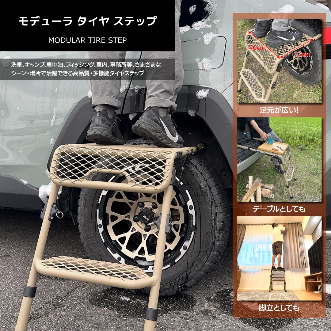簡易的なイスとしてもテーブルとしても使用できます。安定性、安全を目指したタイヤステップ
