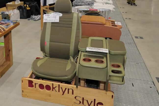 サスペンション、ライト関連、シートなどの商品も展示。実際のその場で購入できるため、来場者は各ブースで商品を見比べじっくり吟味していた。