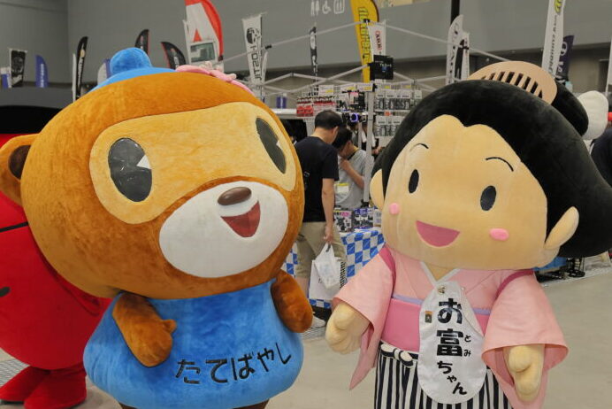 会場のホールA方面へと進むと、一気に雰囲気が変わる。クルマ関連だけでなく、ご当地・群馬のブースやバイクなど他ジャンルのブースがある。地元の野菜の販売もあって、地域と密接に結びついていることがうかがえる光景だ。そして、ご当地のゆるキャラたちも登場。会場を歩くお子様たちに大人気だった。