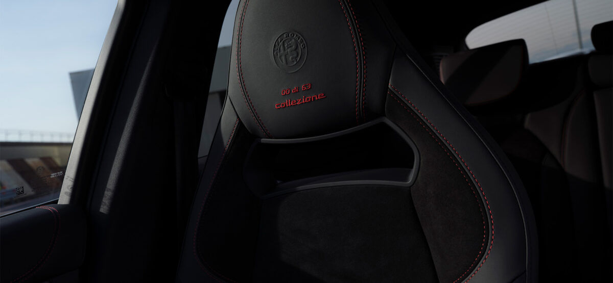 内装は、ドアパネルやセンターアームレスト、ダッシュボードに赤いステッチを施し、ボディカラーとの統一感を演出します。ヘッドレストには、Collezione刺繍と車両ごとのシリアルナンバーの刺繍*を施した特別感のある仕立てです。