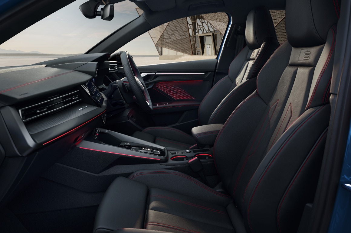 インテリアは、S line plusパッケージに含まれる、レッドのステッチを施したブラックのレザー/アーティフィシャルレザー製のS lineシート、プライバシーガラス、アウディドライブセレクトを装備します。また、MMIナビゲーションシステム、バーチャルコックピットプラス、アウディサウンドシステムにより構成されるナビゲーションパッケージも採用します。さらに、利便性と安全性を高次元で融合させた、電動調整機能付きフロントシート、アドバンストキーシステム、シートヒーターフロント、パークアシストプラス、サラウンドビューカメラ、アウディホールドアシスト、アダプティブクルーズアシスト/エマージェンシーアシスト、ハイビームアシスト、3ゾーンオートマチックエアコンディショナーにより構成されるコンビニエンス&アシスタンスパッケージを標準装備として、プレミアムなドライブエクスペリエンスを提供します。ドアを開ければ、特別装備のドアエントリーライトのSロゴが足元を照らします。スポーツシートにはAudi Sportレッドステッチが施され、ドライビングへの情熱を静かにかつ力強く主張します。室内を彩る、同じく特別装備のアンビエントライティングプロは、光の演出によって洗練されたラウンジのような心地よさを演出します。