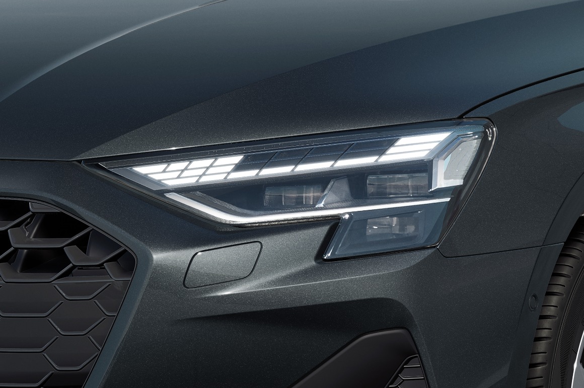 エクステリアにおいては、スポーティなベースモデルS lineの魅力をさらに研ぎ澄ませる多彩な装備が施されています。フロントでは、マトリクスLEDヘッドライトが先進的な表情を演出するとともに、ヘッドライトウォッシャーが実用的な機能美を添えています。また、ダークAudi rings&ブラックスタイリングパッケージの採用により、フロントグリル、フォーリングスエンブレム、エクステリアミラーハウジングがブラックアウトされ、精悍な佇まいをより一層強調しています。これらに加えメタリックペイントが標準採用されます。さらに、足元を彩る特別装備のグラファイトグレーポリッシュ仕上げの5Yスポークデザイン18インチアルミホイールが、サイドビューに力強いダイナミズムを与え、限定モデルとしての完成度を高めています。なお、セダンは特別装備のコントラストルーフブラックとなります。