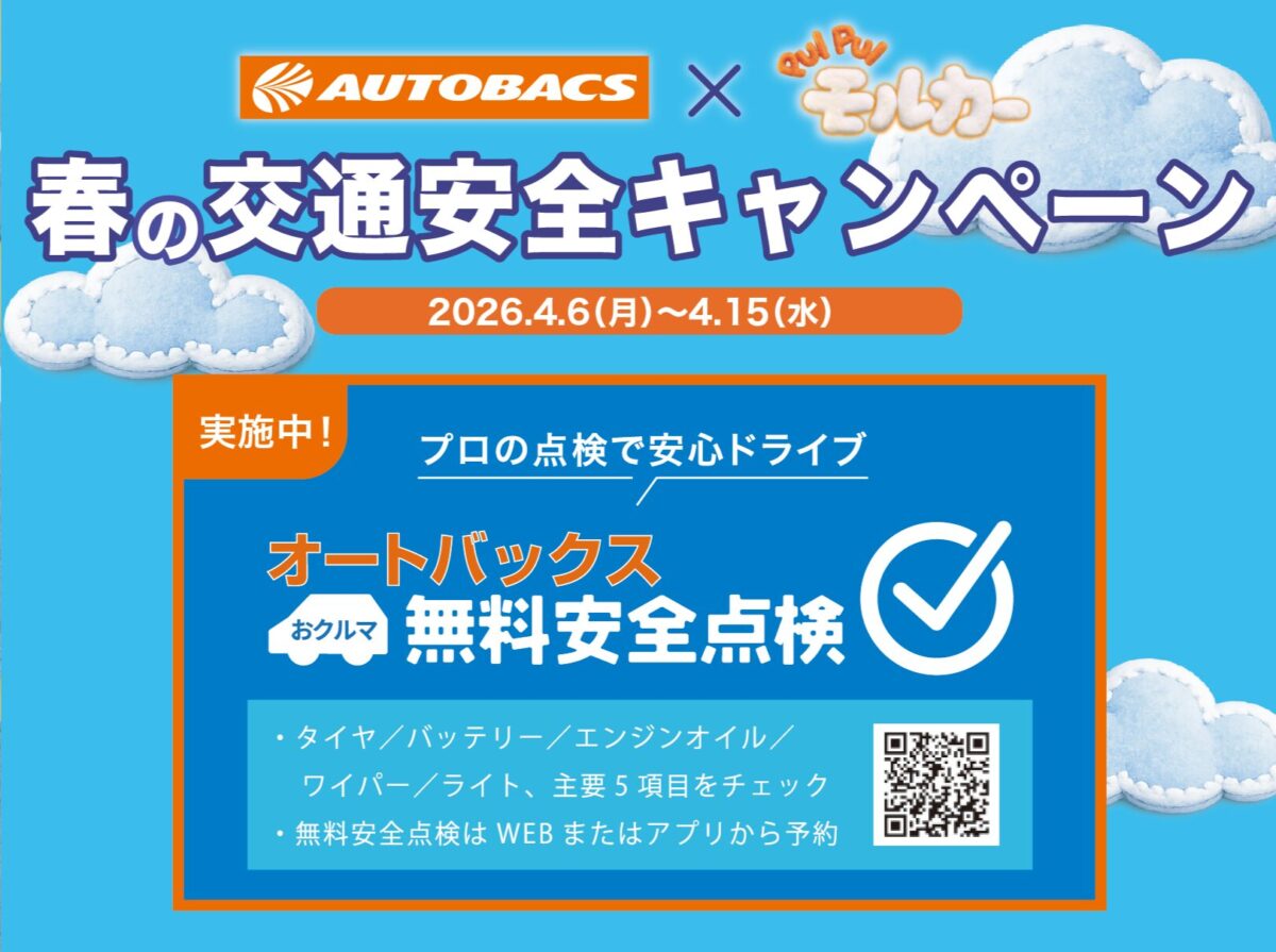 同キャンペーンは、「令和8年 春の全国交通安全運動」に合わせて展開され、人気アニメ『PUI PUI モルカー』とのコラボによる安全啓発企画を実施する。あわせてタイヤやバッテリーなど5項目を点検する無料安全点検の利用促進や、リサイクル素材を使用したオリジナルファイルケースの配布も行う。幅広い世代に向け交通安全意識の向上を図る取り組みとなる。