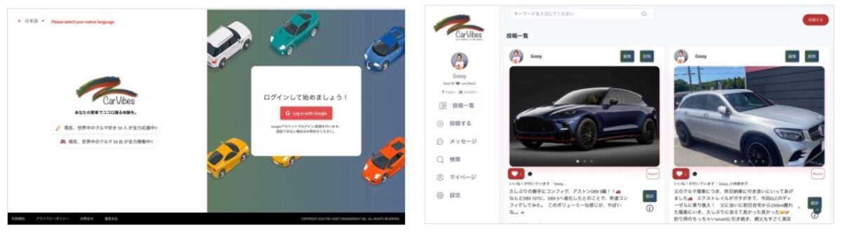 自分が乗ってる「車種繋がり」で様々な人と繋がったり、メンテナンスの時の「こういう時ってみんなどうしてるんだろう?」という悩み・相談から、「ディーラー選び」、タイヤやホイール、その他のカスタマイズ・チューニング、また「どうでも良いつぶやき」に至るまで、ありとあらゆるクルマにまつわる全てを、このCarVibes®で表現したい、そんな壮大なテーマから始まり、日常的に多くのユーザーが感じている課題解決に繋がる糸口としても、役立ててもらえるようにしたい。そして何よりクルマがある生活、クルマを通じて、「楽しさ」や「その魅力」を表現するために、本サービスを9ヶ国言語対応の世界展開をするサービスとして、ローンチするに至りました。