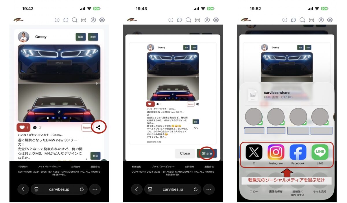 (1)CarVibes®で投稿した内容を他SNSへ転載できる自動転載機能(新機能1)