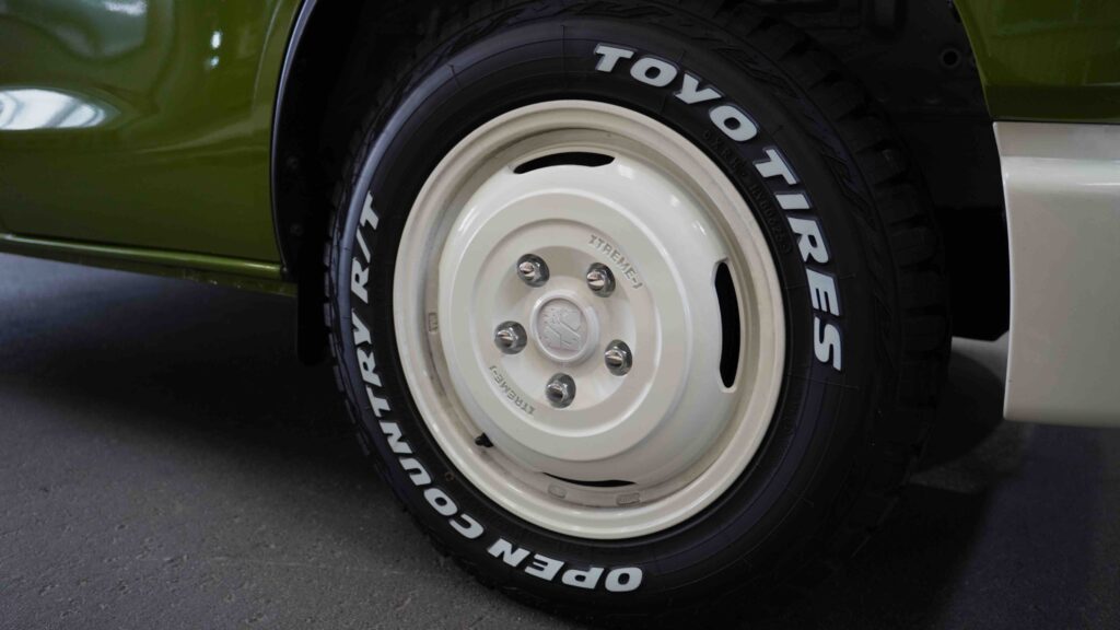 エクステリアにはクラシカルで深みのあるオリーブグリーンの全塗装を施し、XTREME-J JOURNEYホイールとオープンカントリーRTタイヤを組み合わせることで、アウトドアにも映える存在感を実現した。さらにエアロキット「Fillmore」を装備し、スタイリッシュかつ力強い印象に仕上がっている。