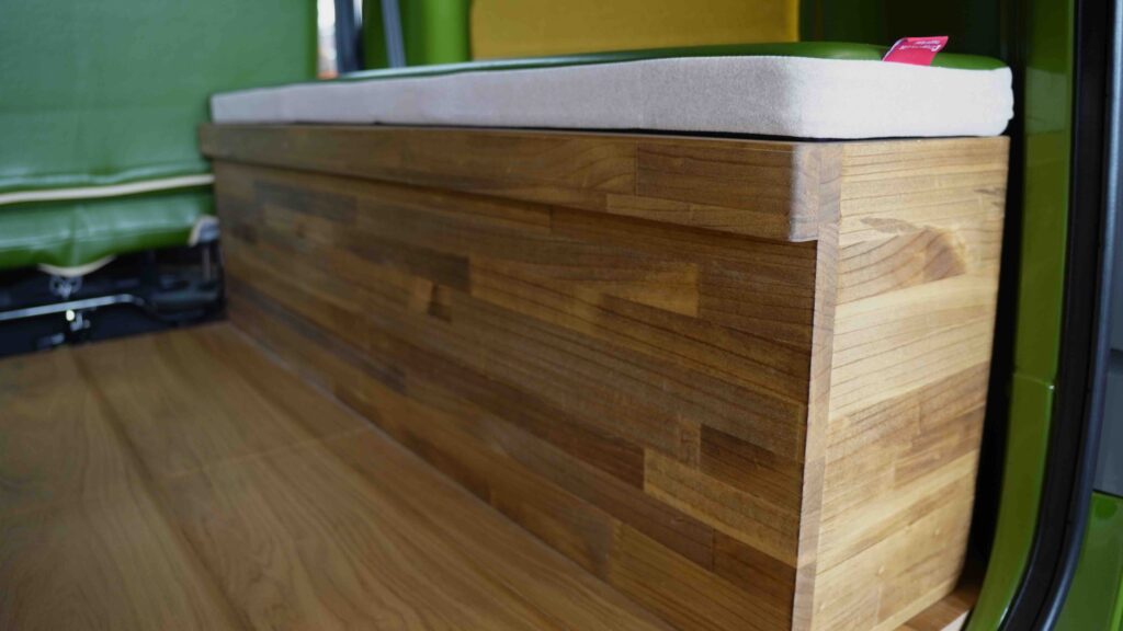インテリアは「Sustainable Style」をテーマに、自然素材の質感を活かしたデザインが特徴。シートカバーやセンターコンソールはSustainable Styleで統一され、ベッドキットにはパイン材、カーゴパネルやドリンクホルダーにはオーク、アシストグリップにはアッシュを採用。木の温もりと上質感を兼ね備えた空間を実現している。