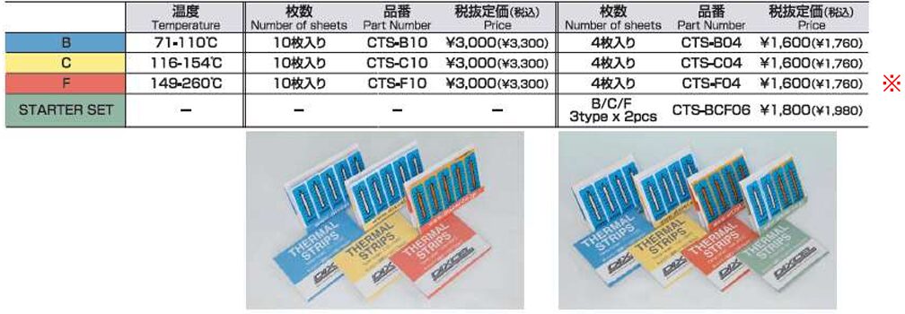 従来品より低温度帯のシールを2種追加し、3種の温度帯シールを2枚ずつセットした「スターターセット」も新たにご用意いたしました。