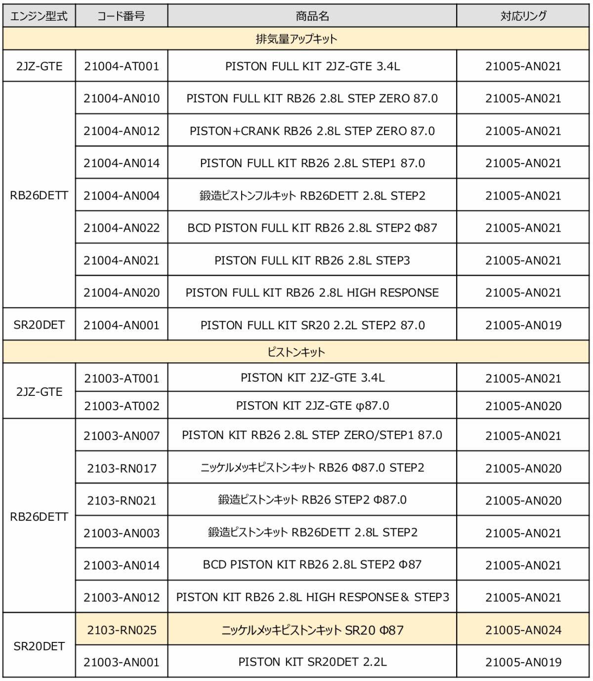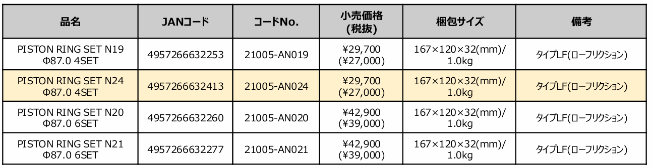 参考:Φ87.0 ピストンリング採用製品一覧(2026年3月現在)