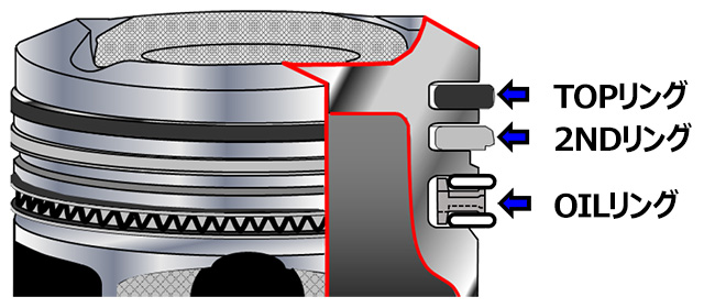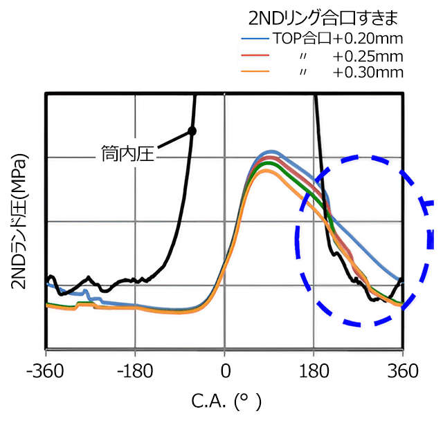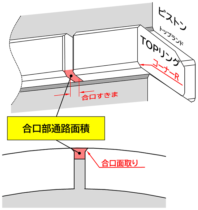 (隙間を拡大しても、TOPリングのシール性を大幅に向上しているため、これまでの性能を悪化させることはありません) - セカンドランド圧力を下げることによってTOPリングの「フラッタリング(リングが溝の中で暴れる現象)」を抑え、シール力を向上させます。
