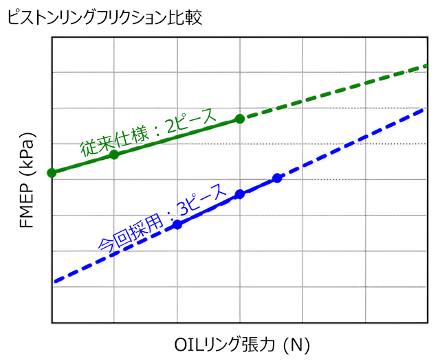 - 張力を低減しても、オイル消費を増加させない構造にしているため、オイルを掻く本来の機能は悪化しません。
