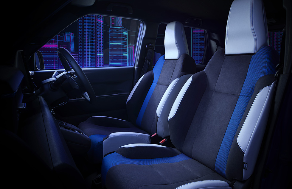 専用のスポーツシートは、高いホールド性で安定したポジションを確保し、ブルーの表皮をアシンメトリーに配色して遊び心を演出しています。水平基調のインストルメントパネルで、運転に集中できる視界を実現しました。