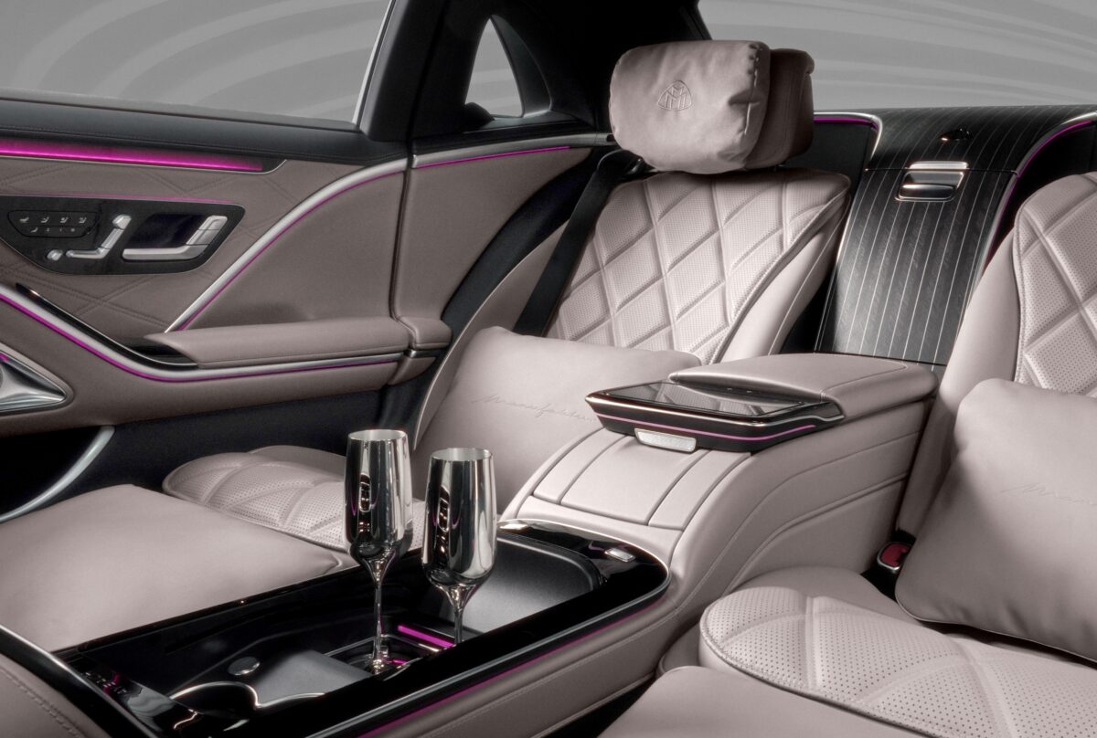 ナッパレザーやウッドトリムなど上質な素材を贅沢に使用したインテリアにも、限定車専用の特別装備に加え、MANUFAKTURのクラフトマンシップが息づく仕立てが随所に施されています。シートは通常モデルでは有償オプションの「MANUFAKTURローズグレー/ブラック(ナッパレザー)」を採用。ヘッドレストにはマイバッハロゴの刺繍が施され、リアにはシート同色のレザーを使用したクッションも備わります。後席が左右独立シートとなるファーストクラスパッケージも採用し、クーリングボックスやシャンパングラスが備わる非日常的な移動空間を演出します。