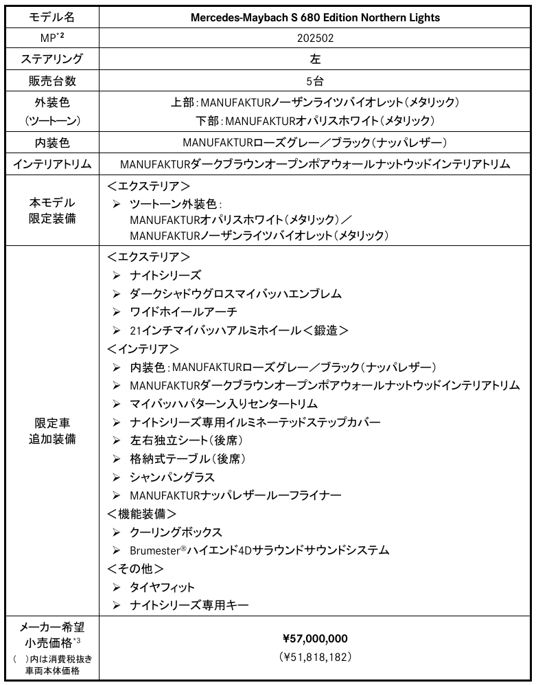 メルセデス・ベンツ日本合同会社は、メルセデス・マイバッハ S クラスの特別仕様車「Mercedes-Maybach S 680 Edition Northern Lights」を全国限定5台で発売すると発表した。