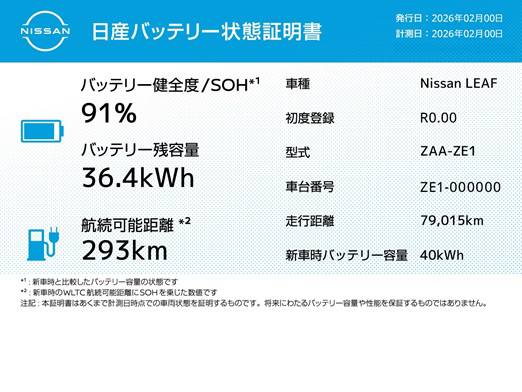 「日産バッテリー状態証明書」とは、日産が中古EVのバッテリー状態を確認し、販売車両のバッテリー健全度をメーカーとして公式に証明するものです。中古EVの走行距離や車両状態だけでなく、バッテリー健全度をメーカーが証明することで、中古EVのバッテリー状態に対する不安を軽減し、中古EVを安心して購入できる環境を整えることで、中古EV市場の活性化を図ることを目的としています。今回はトライアル運用として、千葉県内の販売会社3社*1と連携し、ZE1型リーフを対象に証明書の発行を開始します。
