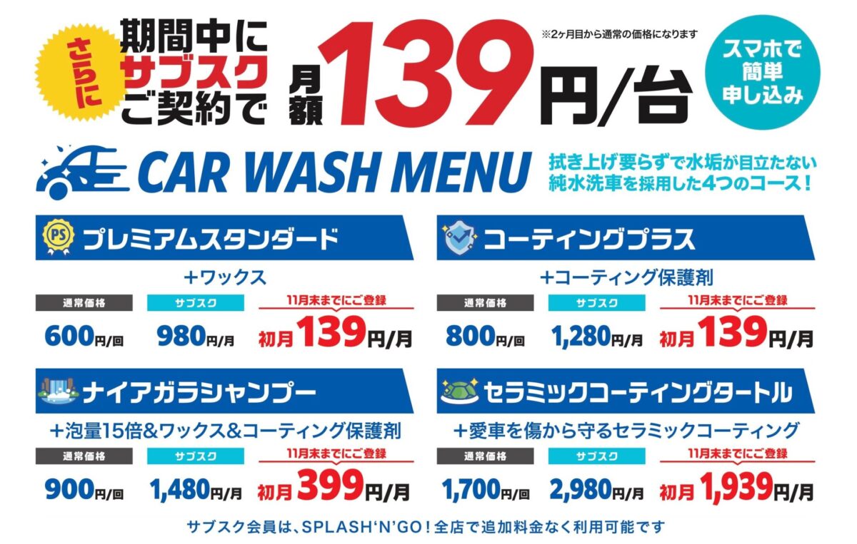 「こんなに早いのに、こんなにキレイ」。100円の初回体験で、もしそう感じていただけたなら、さらにお得なサブスクも、ぜひご検討ください。オープン記念の今だけ、全店舗で洗車し放題の各種サブスクプランを、初月139円からご利用いただける特別な価格でご用意しました。(~11月末まで)
