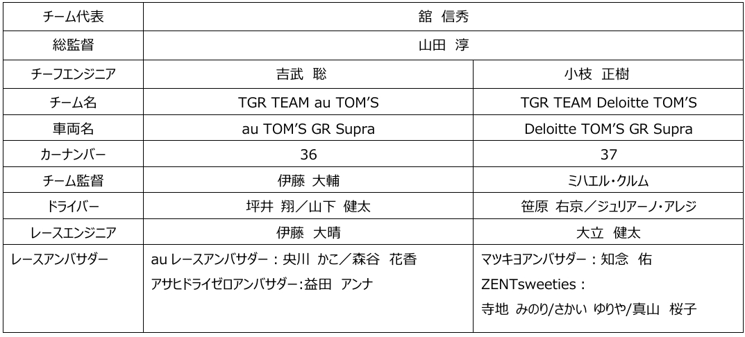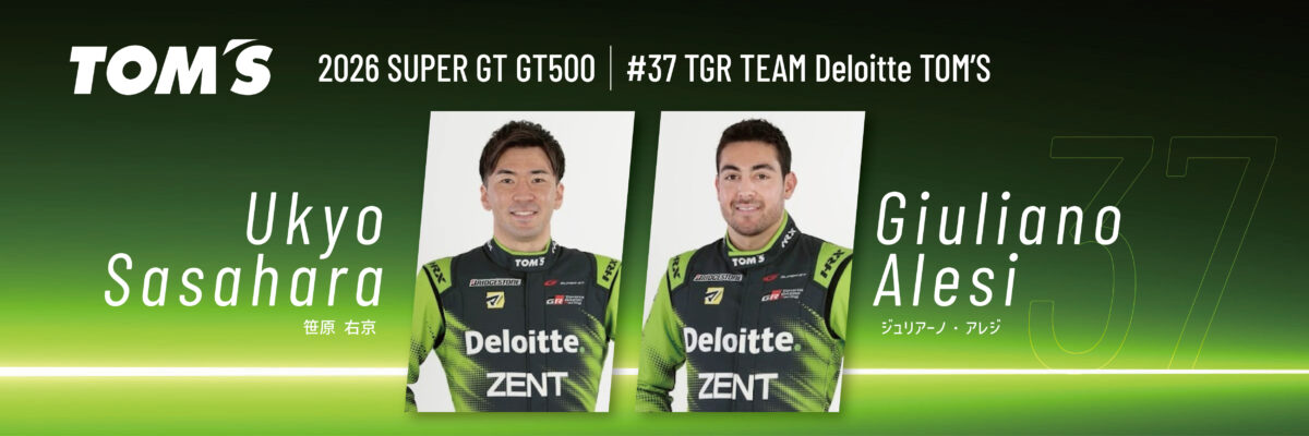 37 号車は、「合同会社デロイト トーマツ」様をメインスポンサーに、「TGR TEAM Deloitte TOM’S」として活動いたします。ドライバーは昨年に引き続き、笹原右京選手とジュリアーノ・アレジ選手のコンビで参戦。監督も昨年同様にミハエル・クルムが継続いたします。