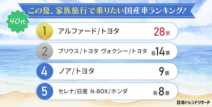 続いて、40代の男女が選ぶこの夏、家族旅行で乗りたい国産車ランキングを紹介します。