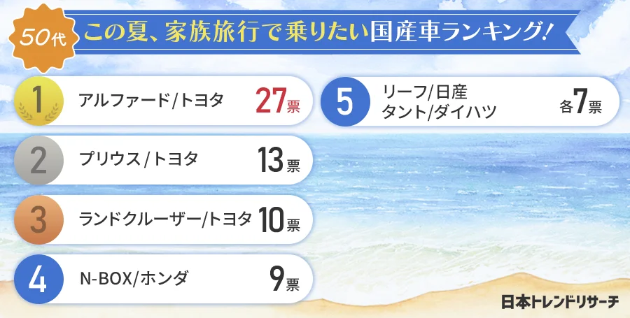 続いて、50代の男女が選ぶこの夏、家族旅行で乗りたい国産車ランキングを紹介します。