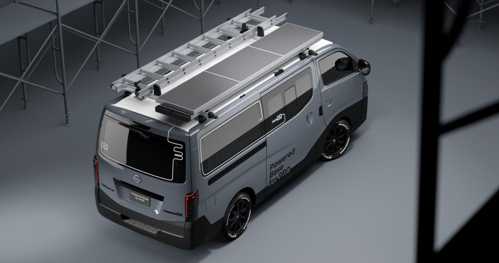 電気自動車リーフの再生バッテリーを活用したポータブル電源を「キャラバン」に4つ搭載し、様々な現場でプロ(PRO)の活躍をサポートする基地(Powered Base)を提案します。クルマには太陽光パネルも装備し、大容量の電力が供給可能です。電動工具の充電も、車内での快適な休憩も全てポータブル電源がサポートします。また、車両装備として可動式の工具棚や、除菌空調システム等、タフな現場のニーズを満たす充実の装備が満載の1台です。(参考出品)