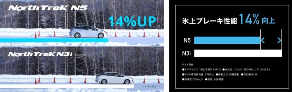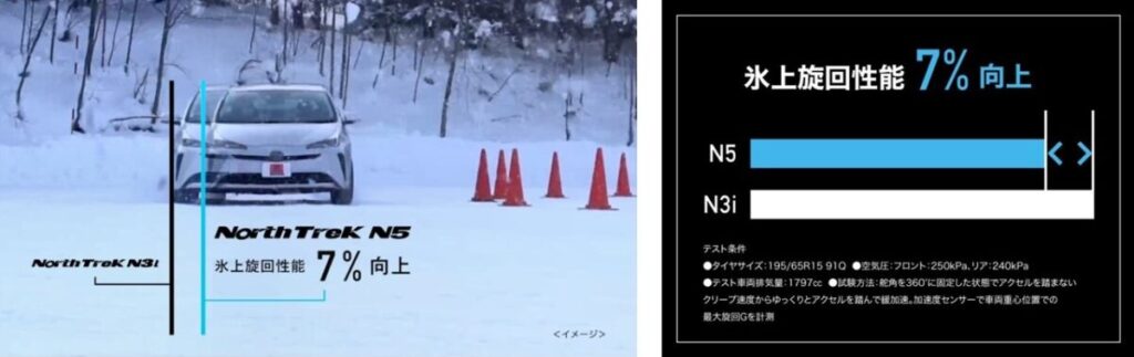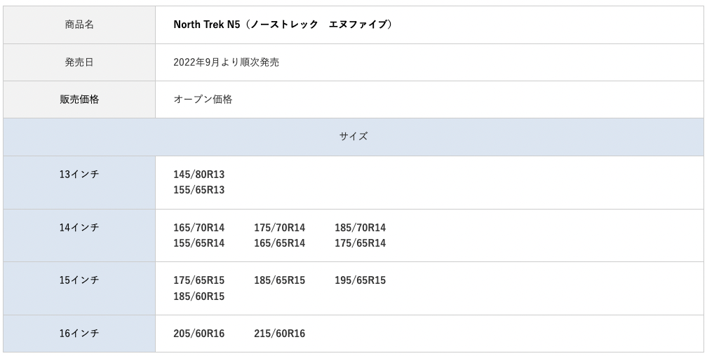 このたび新発売する「North Trek N5」は、「North Trek N3i」(2015年9月発売)の後継モデルです。「North Trek N3i」の高い基本性能はそのままに、左右非対称パターンの採用により、ノーストレック史上最高の氷上性能を実現したスタッドレスタイヤへと進化しました。発売サイズは合計14サイズ(13~16インチ)を取りそろえ、幅広い車種に適合するラインアップといたしました。