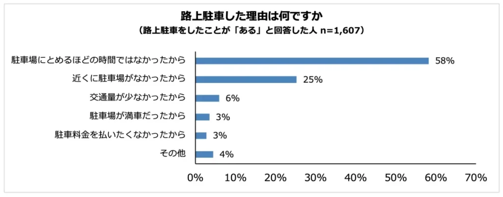 路上駐車をした理由については、「駐車場にとめるほどの時間ではなかったから」が58%で最多でした。次いで、「近くに駐車場がなかったから」25%、「交通量が少なかったから」6%となっています。回答の傾向は過去に実施した結果と比較しても大きな変化はありませんでした。