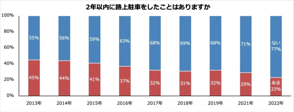 2年以内に路上駐車をした経験があると回答した人は23%で、路上駐車に関する意識調査を開始した2013年と比較すると22ポイント減少しました。意識調査の開始以降、路上駐車の経験者比率は減少傾向にあり、2021年から3割を下回っています。