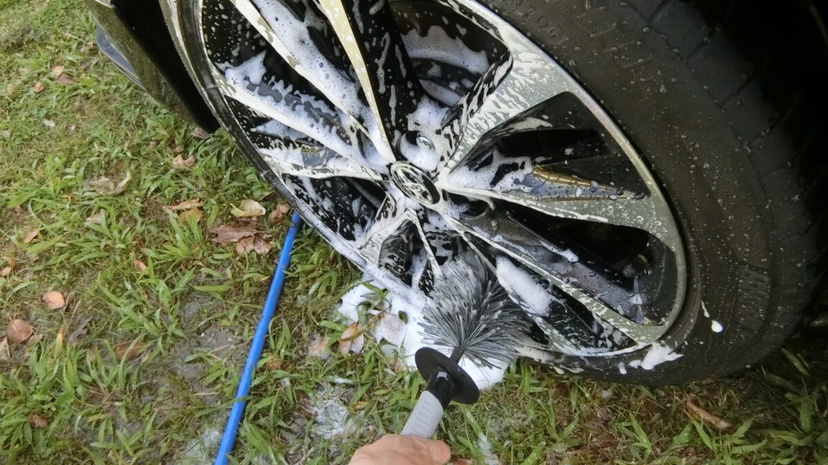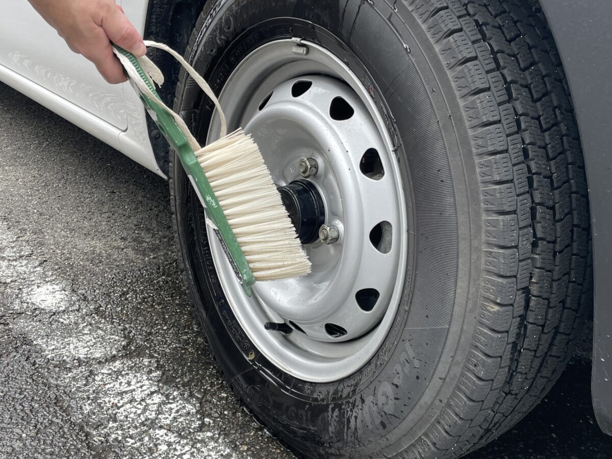 ホイールもたわしやスポンジで洗いましょう。泥や砂は落ちやすいのですが、鉄粉はがんこなので鉄粉除去剤を使うのもひとつの手。その際は、薬剤がタイヤにつかないように注意します。