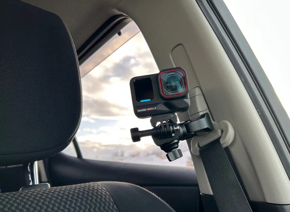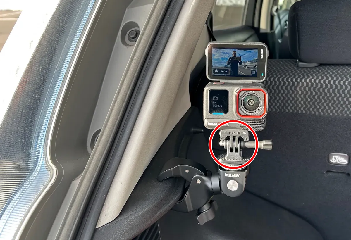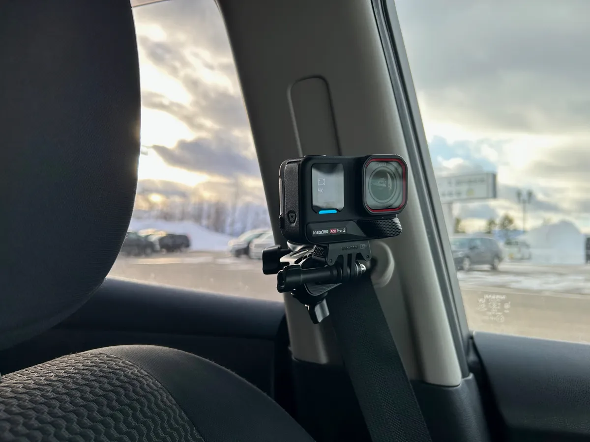 これはアクションカメラのマウントとしてはよくある「該当箇所を挟み込んで固定するマウント」で、僕はこれを助手席のシートベルトホルダー(?)に固定してAce Pro 2をマウントしました(シートベルトの動作に支障なし)