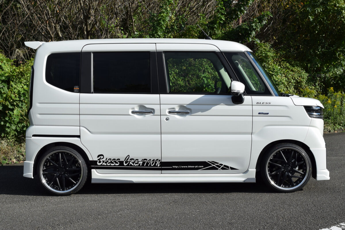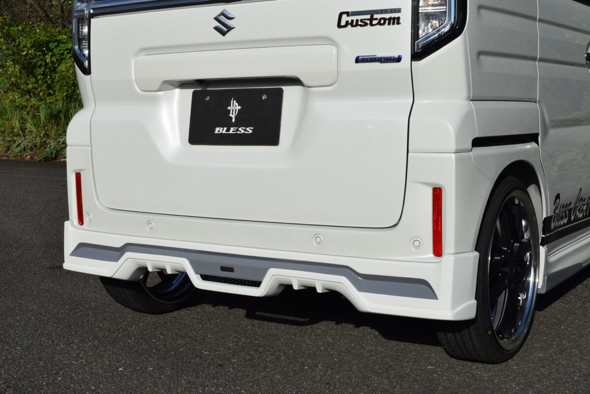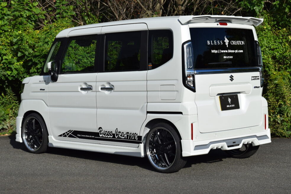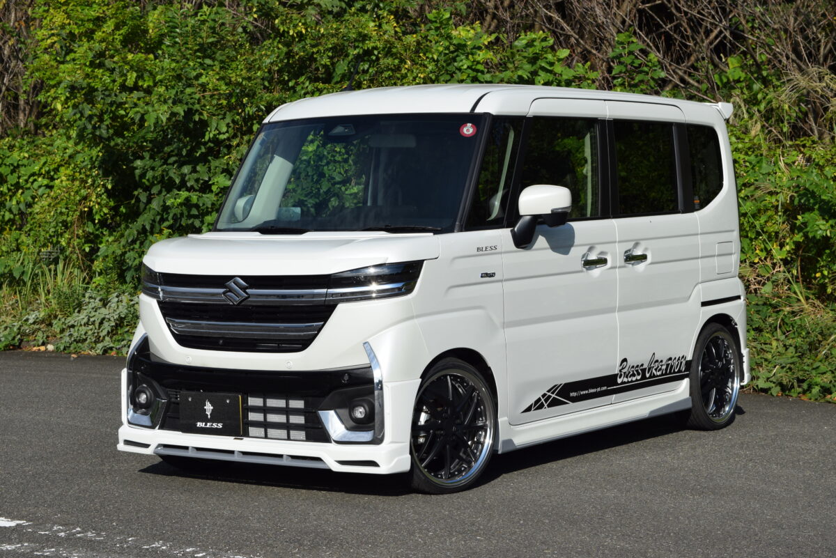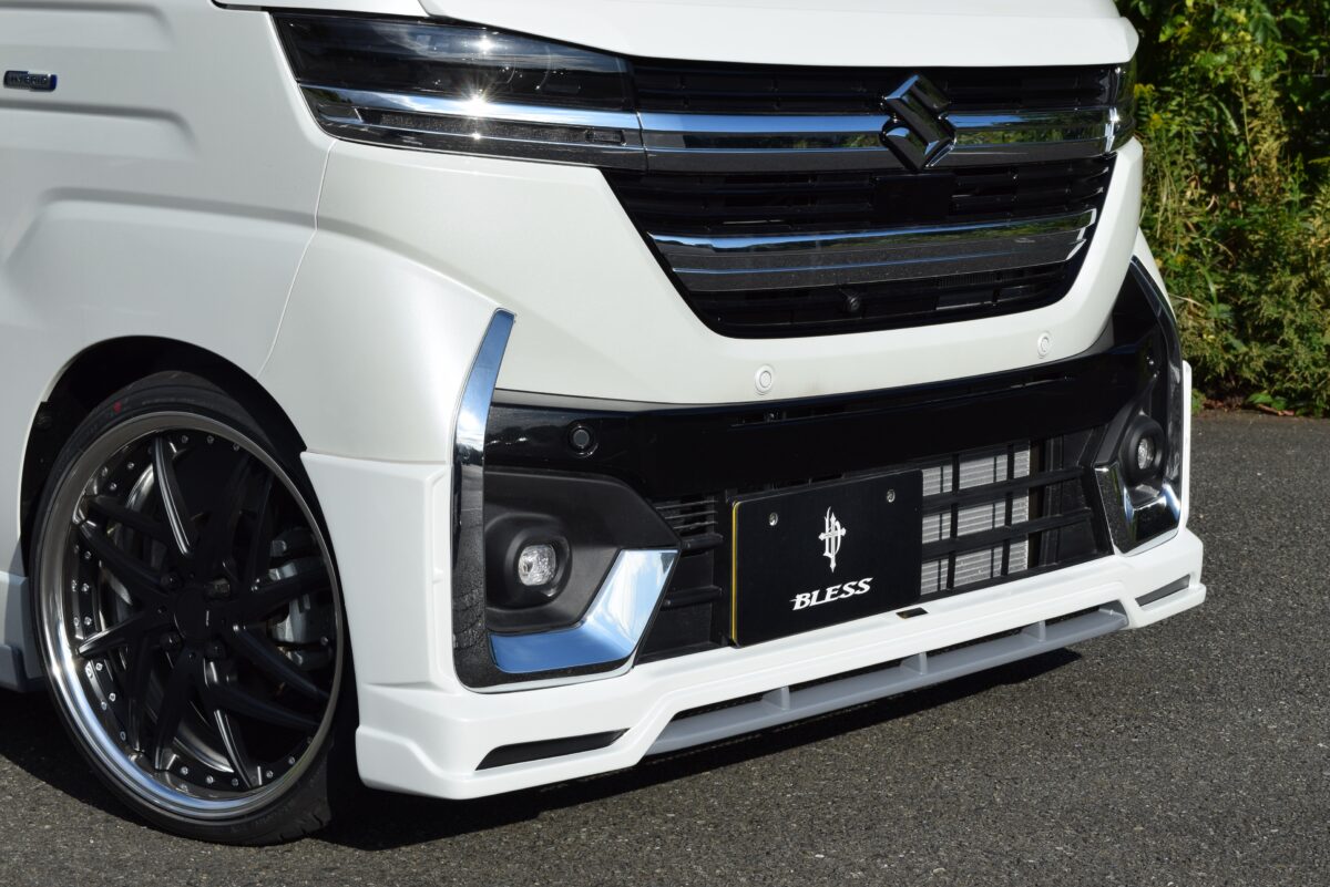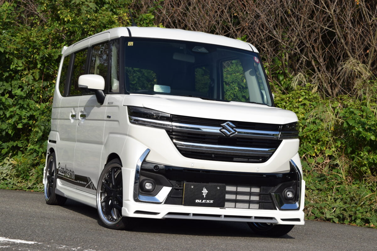 先代(2代目)スペーシアカスタム用のエアロパーツも好評というブレスクリエイション。より精悍になった印象の新型(3代目)についても、ベースの押し出しの強さをいっそう強調するデザインテイストを踏襲する。