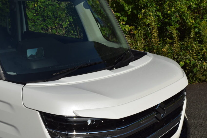 フードトップスポイラーは、LEDヘッドライト化された新型スペーシアカスタムだからこそ可能になったパーツだ。ヘッドライトの照射を妨げることもなく、もちろん車検もノープロブレムだ。