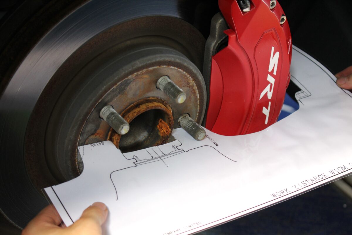 「ここまで細かく作業してくれる店はなかった」と言われることも多く、県外からの来店が多いのも納得だ。とくに並行輸入車やデータの少ない車種では、ホイールメーカーから断面型紙を取り寄せ、実車に当てて装着可否を判断するなど、手間を惜しまない姿勢が光る。