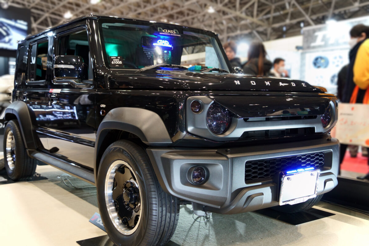 ブースの象徴である金銀の「クリスタルベンツ」が煌々と輝く一方で、黒いボディとスモークレンズによるダークな世界観で異彩を放つのが、ジムニーノマドをベースにした「D.A.D NOMADE」だ。