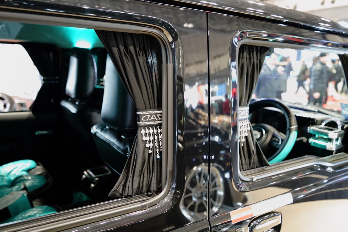 インテリアからエクステリアに至るまで、まばゆいばかりの装飾が実現する荘厳なスタイルは、実に多彩な製品ラインナップによって完成される。定番の車種専用テーブルシートカバーはもちろん、カーテンティッシュケースに至るまで、贅を尽くしたアイテムの数々が乗員を優雅に迎え入れる。