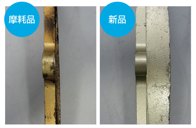 ディスクローターはバッドに挟まれるため、走った分だけ摩耗する。下の写真のように摩耗したものは厚みが減るため、制動力が低下したり時にはガタが出る場合もある。また、ディスクローターが摩耗すると、せっかくパッドを新品に交換してもその効果は半減してしまう