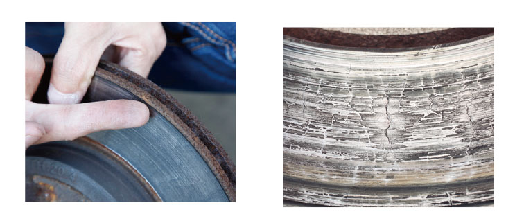ディスクローターが摩耗すると表面に無数の溝が刻まれ制動力が低下する。また、高温になるため、それを繰り返していると右の写真のようにひび割れる場合もある。