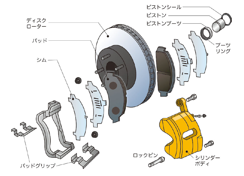 一般的な乗用車に採用されているディスクブレーキは下のイラストのような構造となっている。様々な部品から構成されており、長年使用するとこれらが摩耗、または劣化し、効きが悪くなってくる。定期的な点検は必ず必要だ。