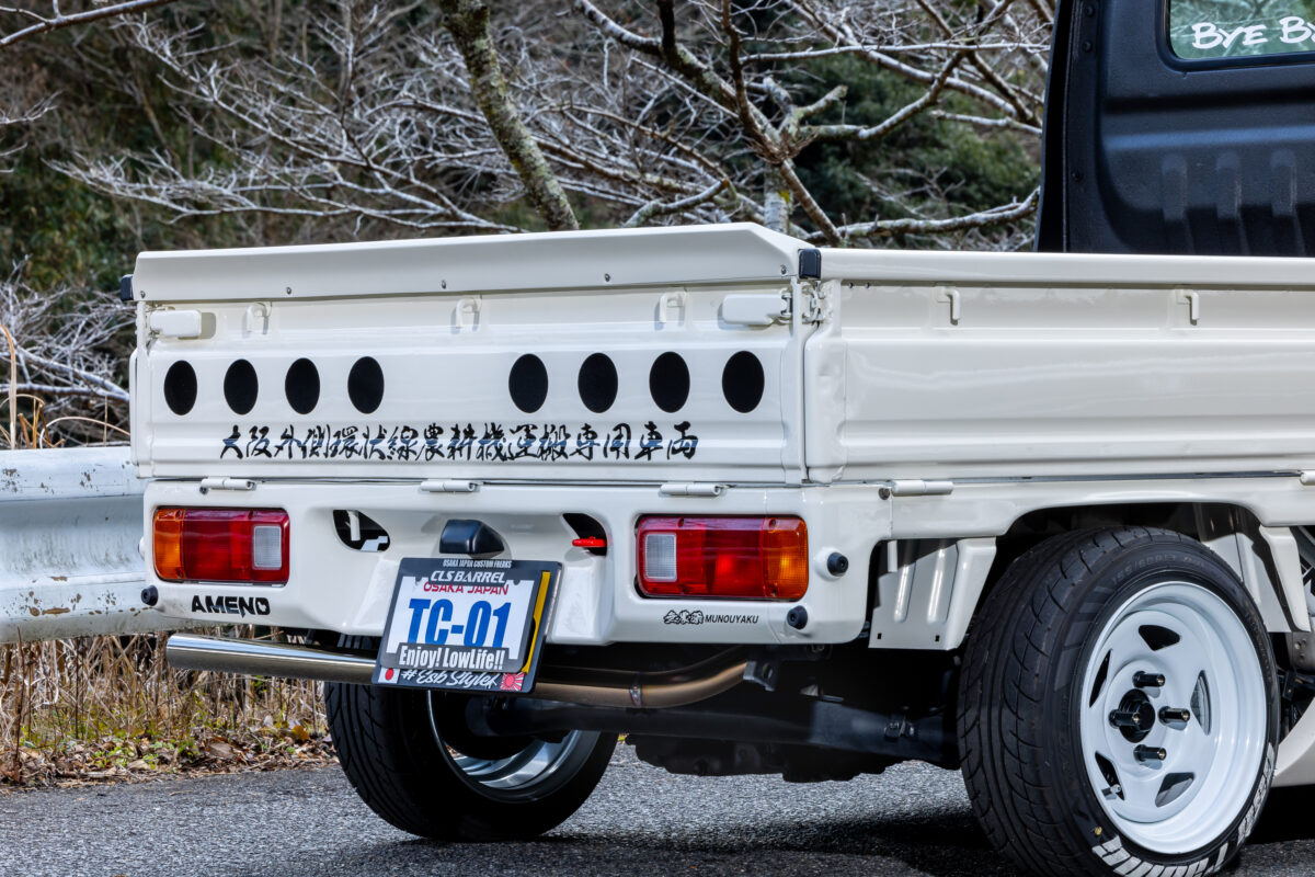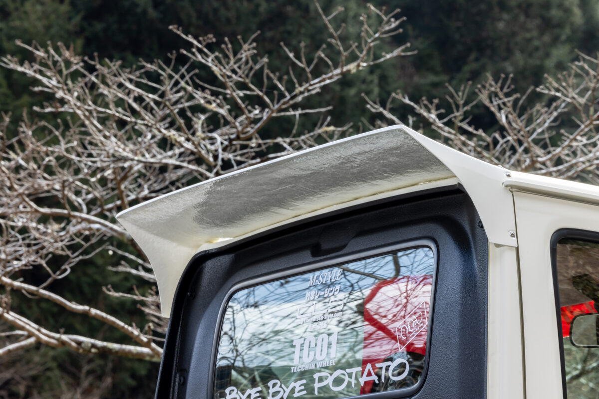 リアウイングと合わせて旧車スタイルを感じさせるのが、アオリに取り付けたリアゲートウイング。軽トラック汎用品ながら、両サイドを絞り込み、立ち上げた形状により、スポーティなリアビューを作り出す。