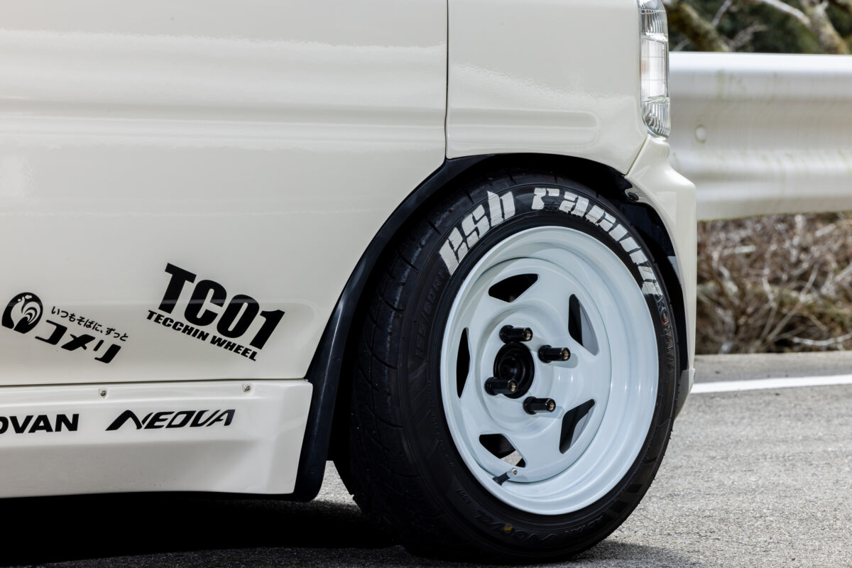 ホイールには、ESBがプロデュースしたオールスチール製ホイールCLS TC-01を装着。「13×7J +25」という小径ワイドなサイズで、星型ディスクとディープリムを融合した1本だ。マッチングするタイヤは、レーシングタイヤとして名高いアドバン・ネオバ(165/60 R13)。肉感的な足元がレーシーなムードを高めてくれる。
