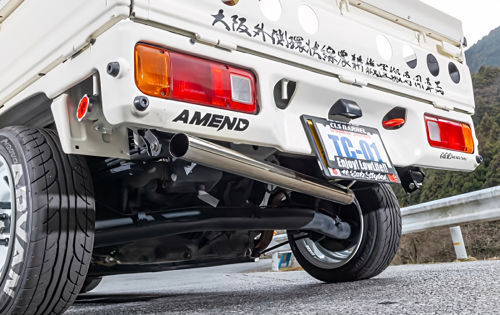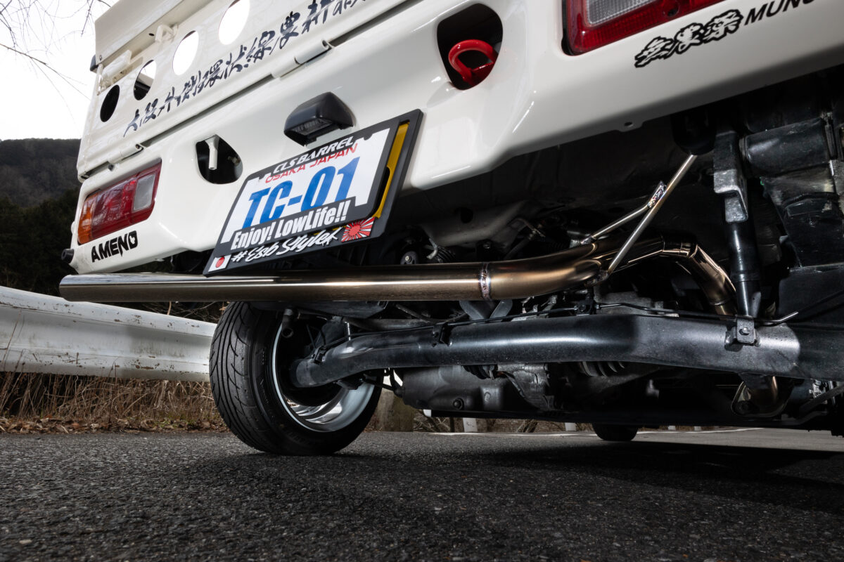 マフラーは、かつて大阪環状線を激走していたグランドシビック(4代目/EF型)、スポーツシビック(5代目/EG型)をオマージュし、腹下からテールランプまで伸びるパイプ(競技用部品RM管を採用)を用意。よりマイルドなサウンドのサイレンサー付タイプ(競技用)もラインアップする。
