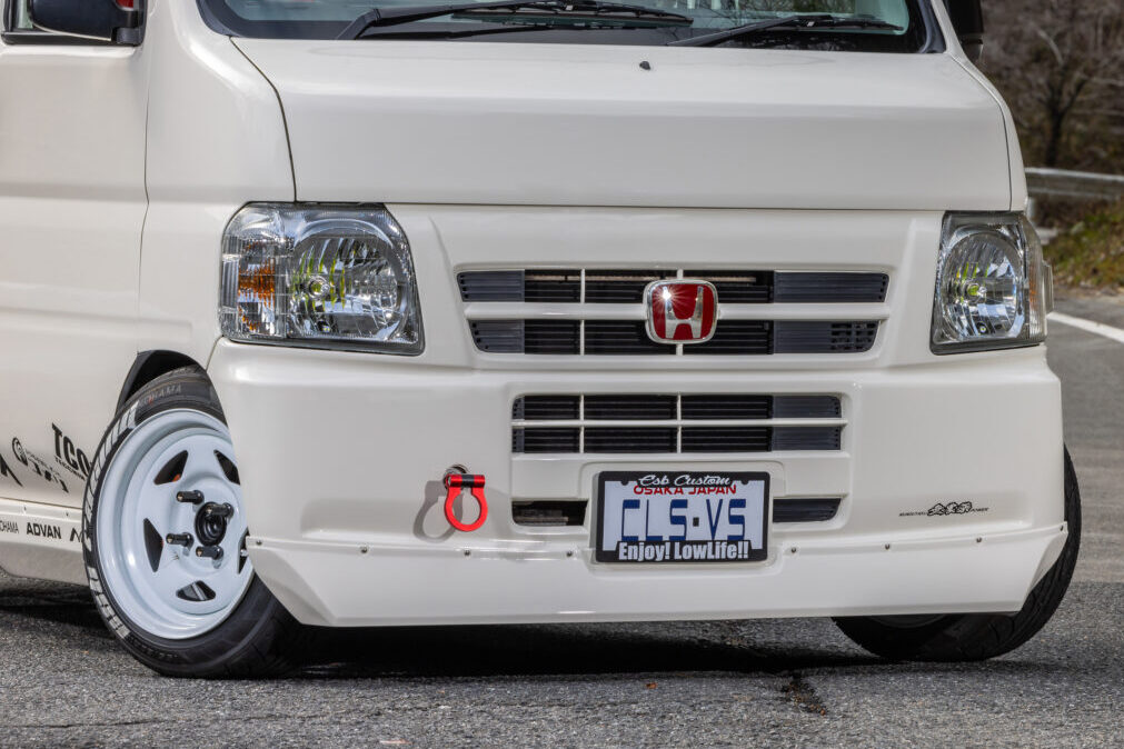 CLS VSホンダ・アクティトラックを見ていくとしよう。まずはフロント。ボンネットやフロントバンパーはそのままに、ボトムに両サイドから絞り込んだ突き出た形状が印象的なフロントスポイラーを装着。別名“チンスポ”と呼ばれる形状だ。ビス留めして取り付けているあたりも、レーシーさを増幅している。