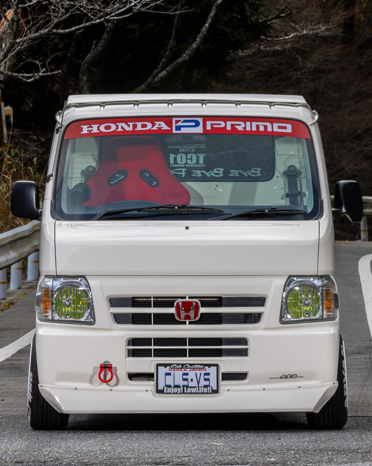 シビック・タイプR純正のチャンピオンシップホワイトボディに、レッドのホンダエンブレム、フロントウインドウには「HONDA PRIMO」のハチマキをおごったCLS VSアクティトラック。グッと低く構えたフェイスに、フォーミュラーカーさながらのサイドアンダー、ルーフにはかつてのシビックを彷彿とさせるリアウイングを備えたスタイリングは、まさに“アクティ・タイプR”と呼ぶにふさわしい。ホンダ好きならずとも所有欲をそそられるのは間違いないのだ!
