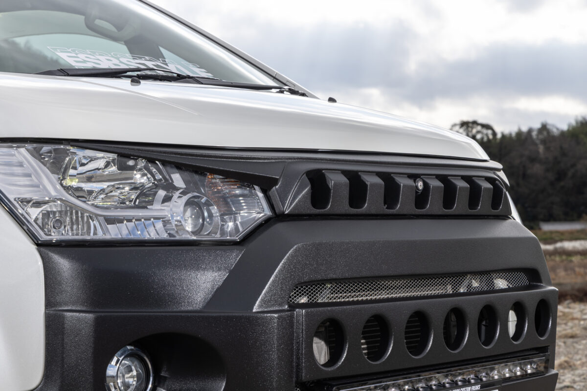 両サイドは絞り込みながらボトムを立ち上げることで、タイヤのトレッドをしっかり見せているのもポイントだ。バンパー下部にはアンダーガード風デザインを採用。オフロード車に装着されるアンダーガードをバンパーと一体化することで、タフなオフロード感を演出している。純正のけん引フックもそのまま使用可能。ちなみに、両サイドのフォグランプは純正をそのまま移植できる仕様。無駄を出さず実用性を損なわない作り込みはさすがだ。