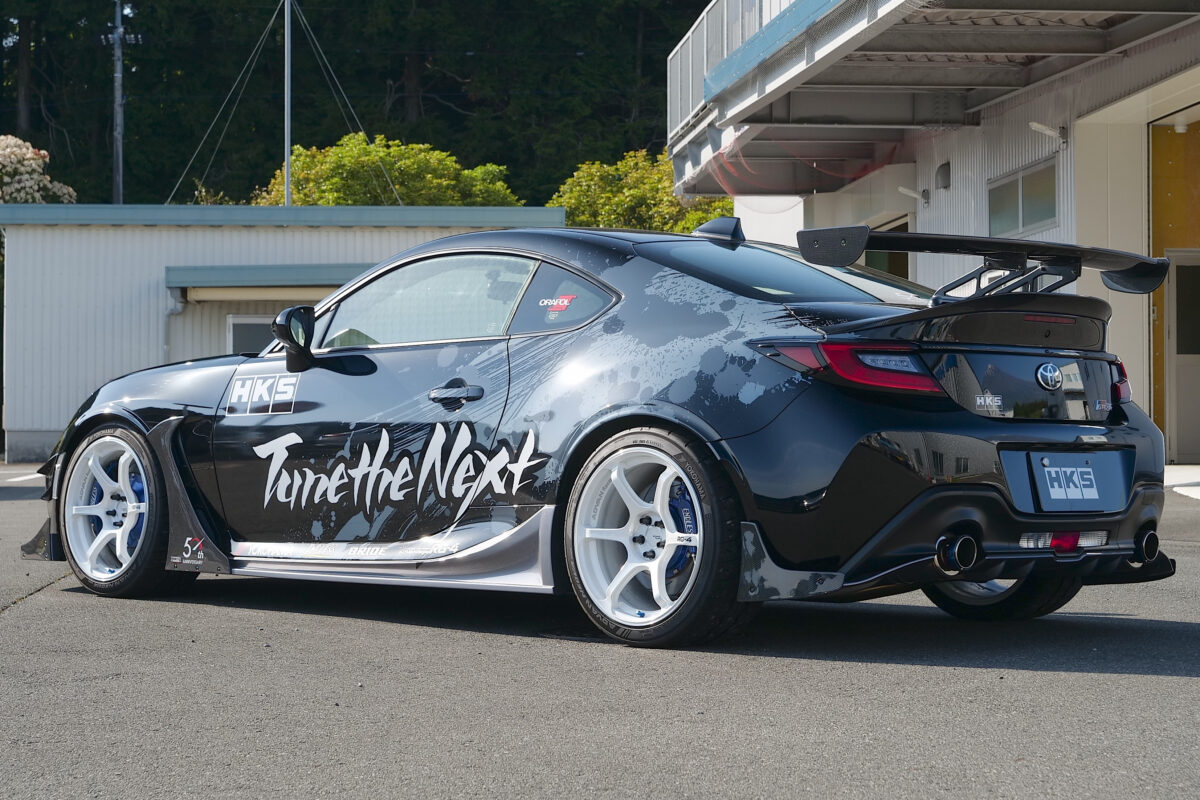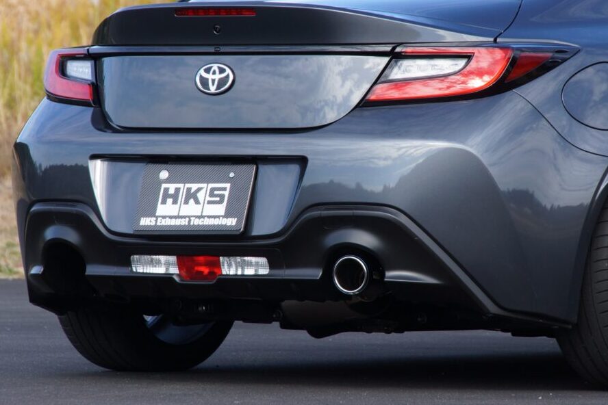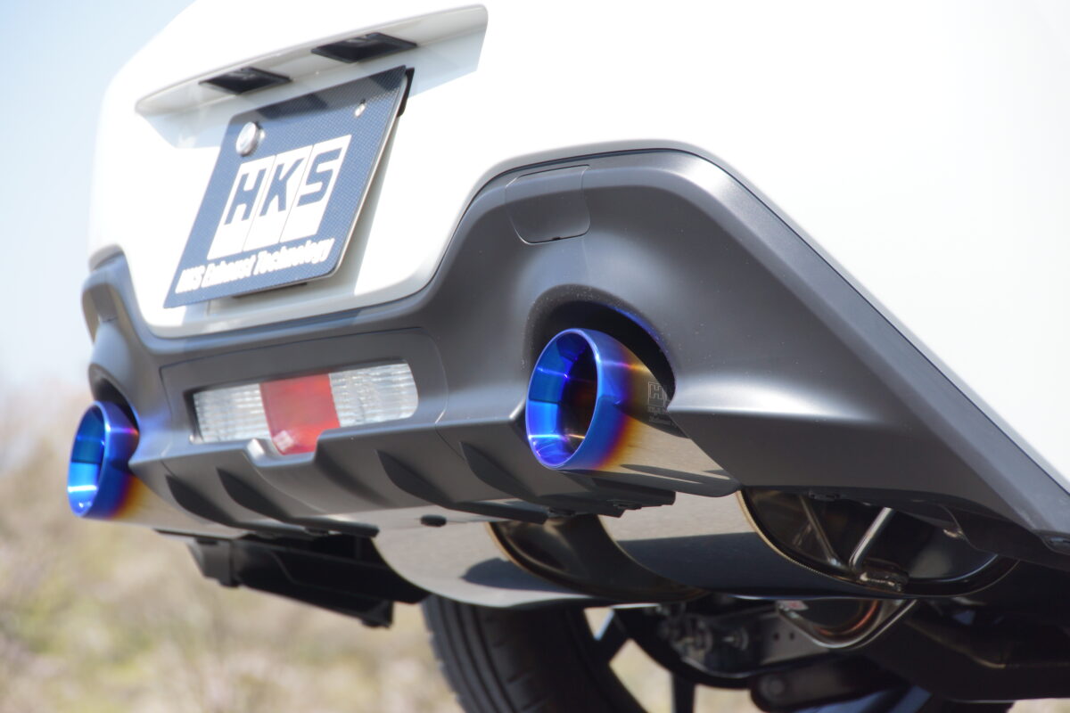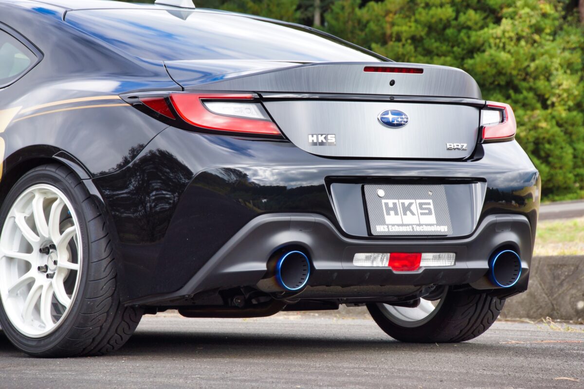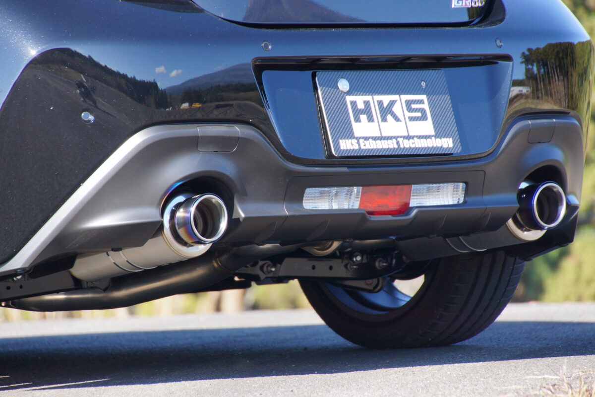 GR86/BRZチューンに力が入るHKSでは、個性が異なる車検対応マフラーを計4タイプ用意。なかでも一番人気というのが『ハイパワースペックLⅡ』だ。左右出しとなるこのモデルは、薄肉のステンレス材を採用することでチタンマフラーに匹敵する軽さを実現したのが特徴。排気効率にも優れており、スポーティなサウンドが楽しめる。