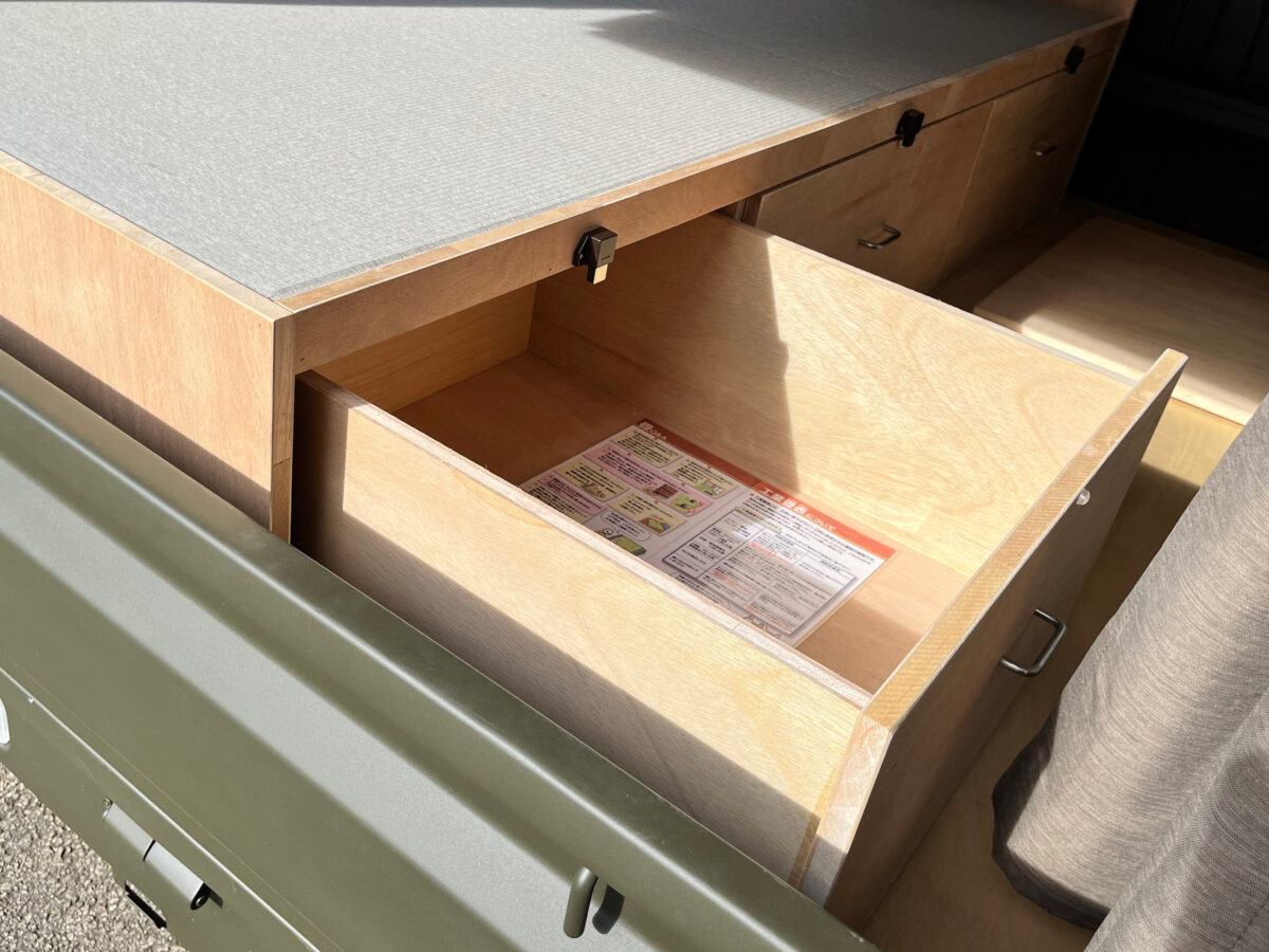 ランプスが新たに製作するパッケージが、「車中泊セット」だ。引き出しがついた木製ベッド(長さ200cm×幅70cm×高さ30cm)を荷台の片側に載せ、天井に木を貼ってダウンライトがパッケージになっている。荷台の空いたスペースには自転車やバイクが載せられ、ベッドの下の収納もたっぷり用意。ベッドは畳になっており、そのまま車中泊に出かけられる仕様となっている。