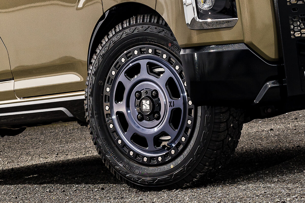 なかでも注目したいのはホイール外周に入ったビードロックデザイン。本場アメリカのオフローダーは険しい岩場などを走る際にエア圧を落すことがある。そうすると、タイヤをホイールのリム部に固定する部分であるビードが空気圧が低くなったことでホイールから外れてしまうのだ。このビード落ちを防ぐため、ビードをホイールにがっちりと保持するためのものが、ビードロックリングと呼ばれるものだ。