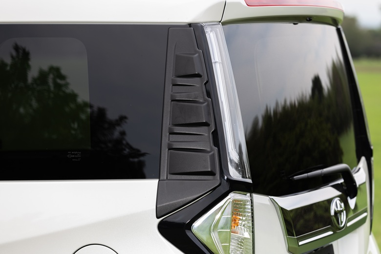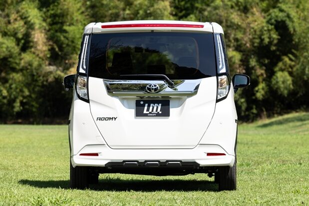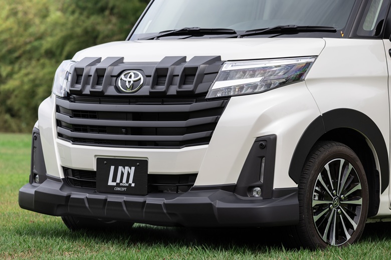 具体的には、「フロントフードガーニッシュ」と「フロントルーバーガーニッシュ」を組み合わせることで、フロントマスクに立体感と奥行きを与える。この4連スロットのデザインは本格オフロード系SUVに通じる「意志の強さ」を感じさせ、ルーミーの表情をぐっと引き締める。